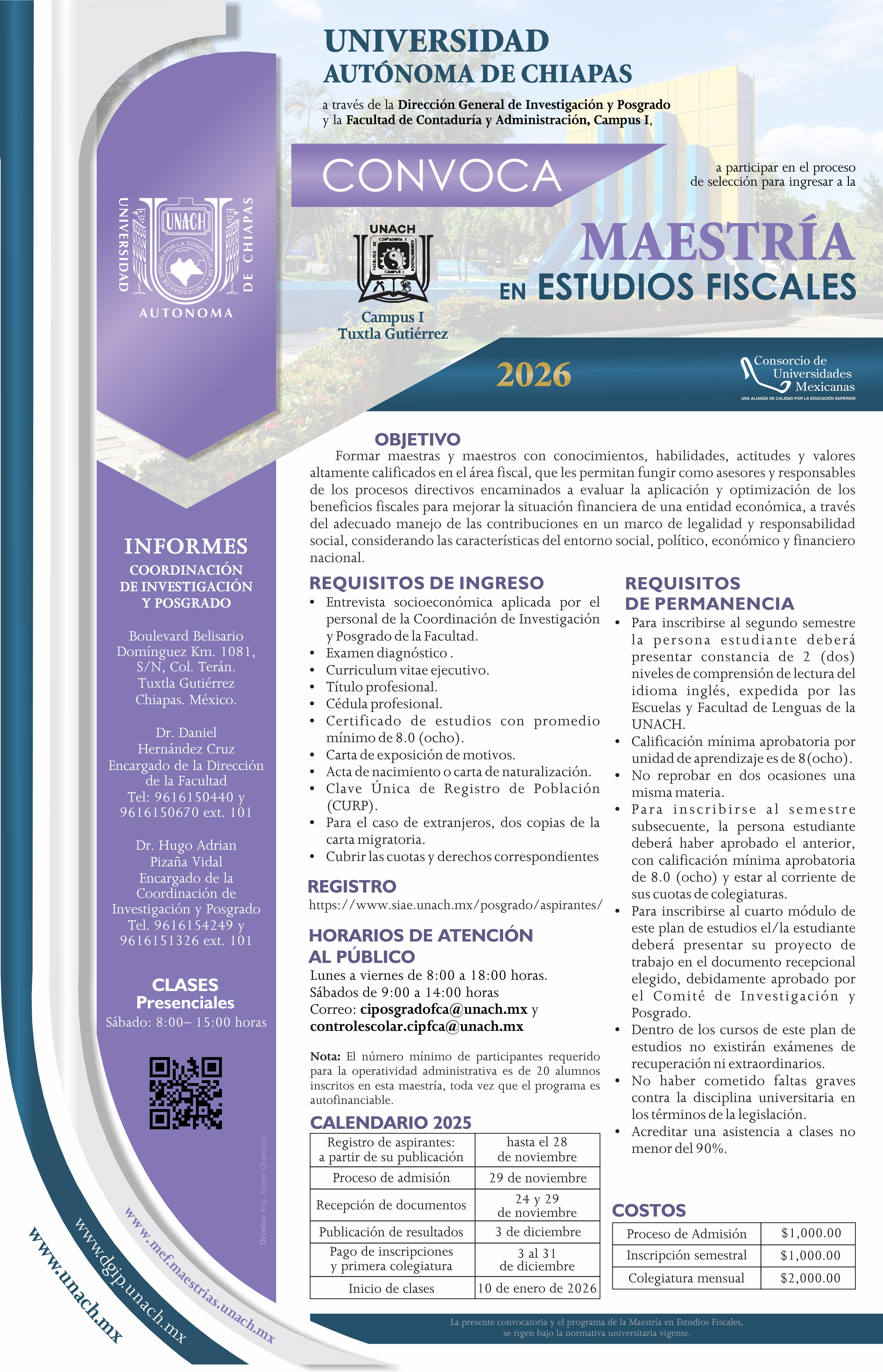 MAESTRÍA EN ESTUDIOS FISCALES. REGISTRO DE ASPIRANTES, HASTA EL 28 DE NOVIEMBRE DE 2025. CAMPUS I TUXTLA GUTIERREZ